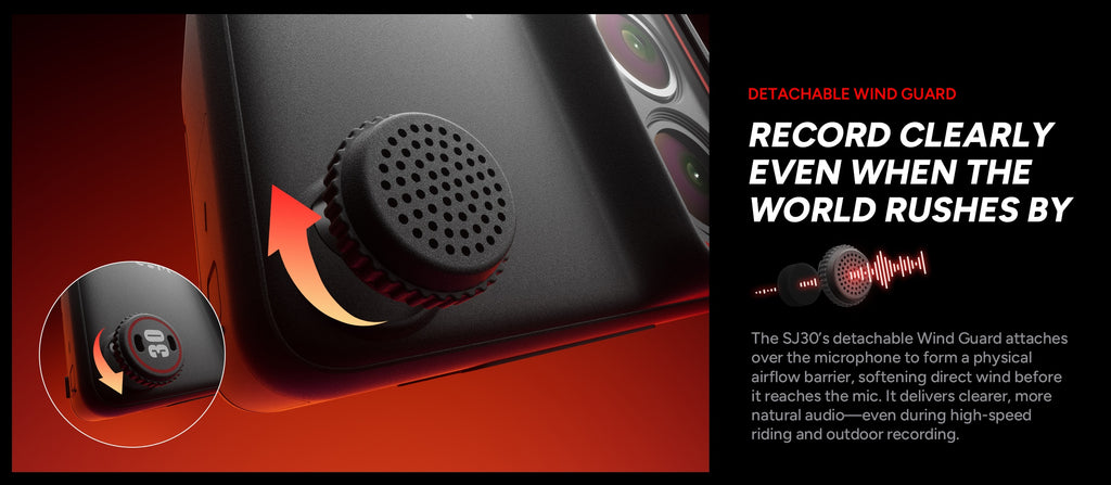 - 【PROFESSIONAL AUDIO CONTROLS】 Features dual built-in microphones for stereo sound, a detachable wind guard for high-speed filming, and full compatibility with the SJCAM M4 wireless microphone system.