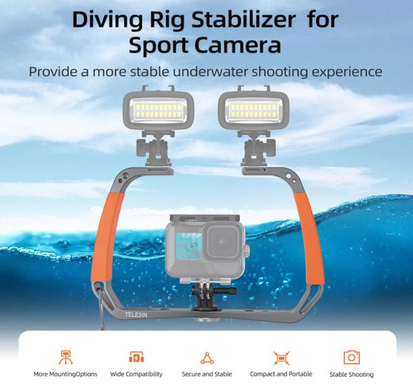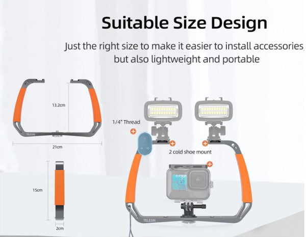 The Dual Handheld Stabilizer for GoPro assists with capturing stable videos and sharp photography on both land and water adventures. The stabilizer has multiple cold shoe and 1/4" connection points that allows accessories such as diving lights, microphones and other action cameras to be added to the stabilizer setup. The device is designed with a non-slip silicone handle which makes it both comfortable and secure to hold for filming.