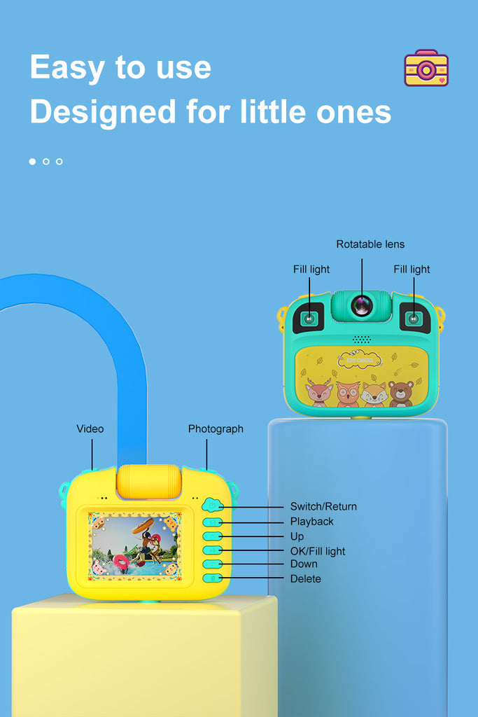 - 【180 Degree Rotating Lens】 The ingenious design empowers young photographers to effortlessly switch between capturing the world in front of them and turning the lens to focus on themselves, adding a dynamic and personal touch to their photography adventures.