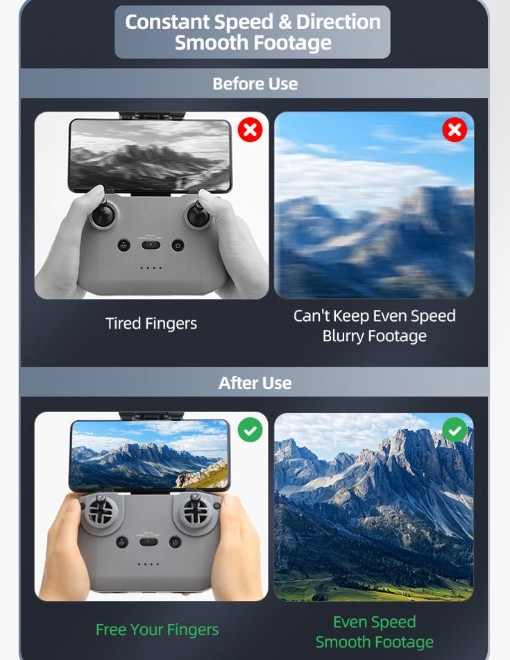 The Remote Control Joystick Speed Controller for Mini 3 2 / Mini 4K / Mavic 3 / Air 2 (RC-N1 Controller) helps keep even flying speed & direction of the drone. The accessory enables the drone to fly at a constant speed to assist with capturing smooth footage. The speed controller has 3 adjustable gears to control the speed of the drone and the dial can rotate 360 degrees which allows for the drones flying angle to be more precisely controlled.