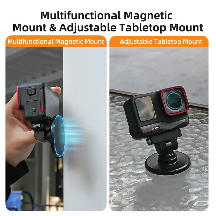 The 180 Magnetic Base Mount for Insta360 X5 / X4 Air / Ace Pro 2 1 provides fast, secure mounting with a strong built-in magnetic lock for effortless attachment and removal. Featuring a 180° adjustable tilt and a standard 1/4" screw base, it offers flexible shooting angles and broad compatibility with tripods, selfie sticks, and mounting accessories. Its lightweight, compact design ensures reliable stability without adding bulk, making it ideal for action sports, vlogging, and everyday filming.