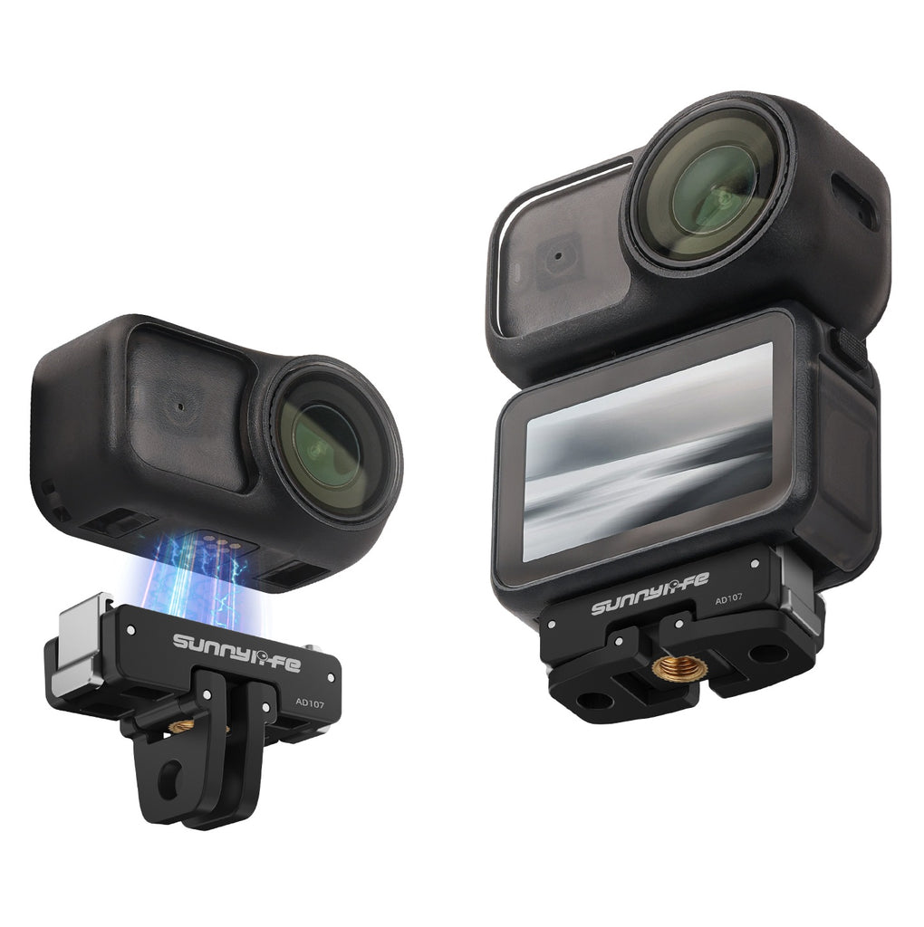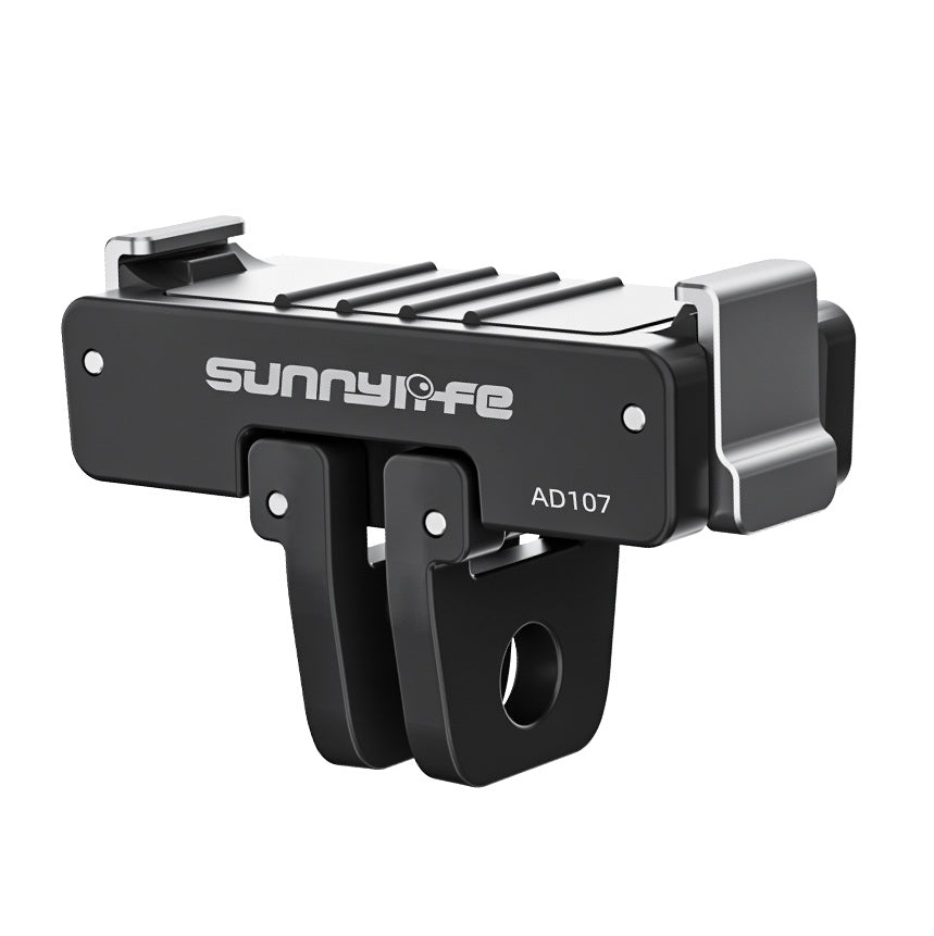 The Magnetic Fork Adapter for Osmo Nano broadens the range of mounting possibilities. It facilitates the attachment of the camera to action camera accessories and mounts via the thumb screw connection. Additionally, the adapter features a 1/4" screw hole on the base, enabling compatibility with various universal accessories possessing a 1/4" screw thread.