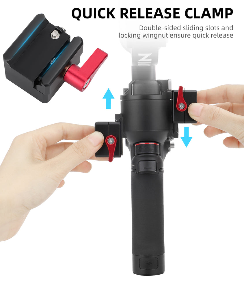 - The plate has been designed to easily clamp on either side of the gimbal device through its double sided sliding slots.